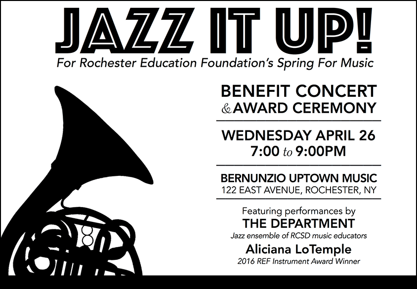 Our third annual Jazz It Up! took place on Wednesday, April 26, at Bernunzio Uptown Music. This year, we honored School of the Arts student Keoni Smith with our REF 2017 Musical Instrument Award. Keoni received a C Trumpet from REF's Spring for Music Opportunities program. He thanked REF, his family, high school colleagues, and teachers for their support, saying he couldn't be the musician he is today without them. He will be taking his new trumpet to the renowned Crane School of Music at SUNY Potsdam in the fall.